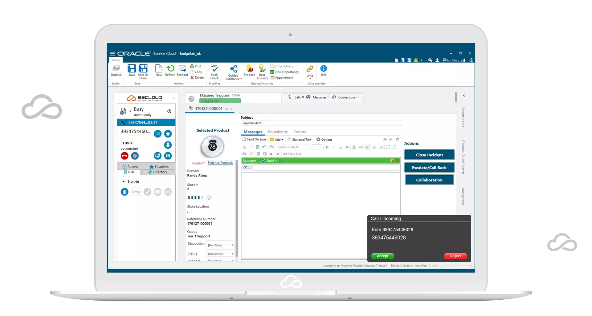 In this way, Customer Service operators are able, using only the Oracle Service Cloud page, to manage daily Inbound and Outbound calls in a single user interface; integration allows operators to have all customer information on screen, thus optimizing and simplifying daily operations.